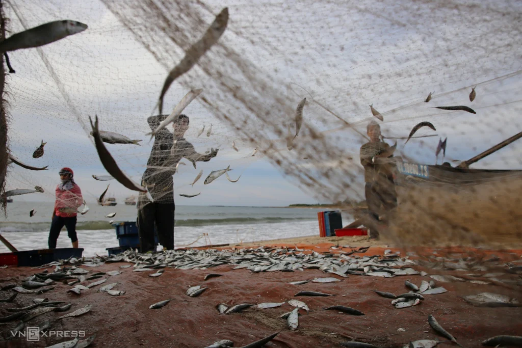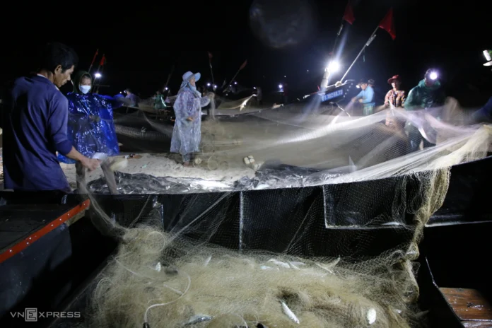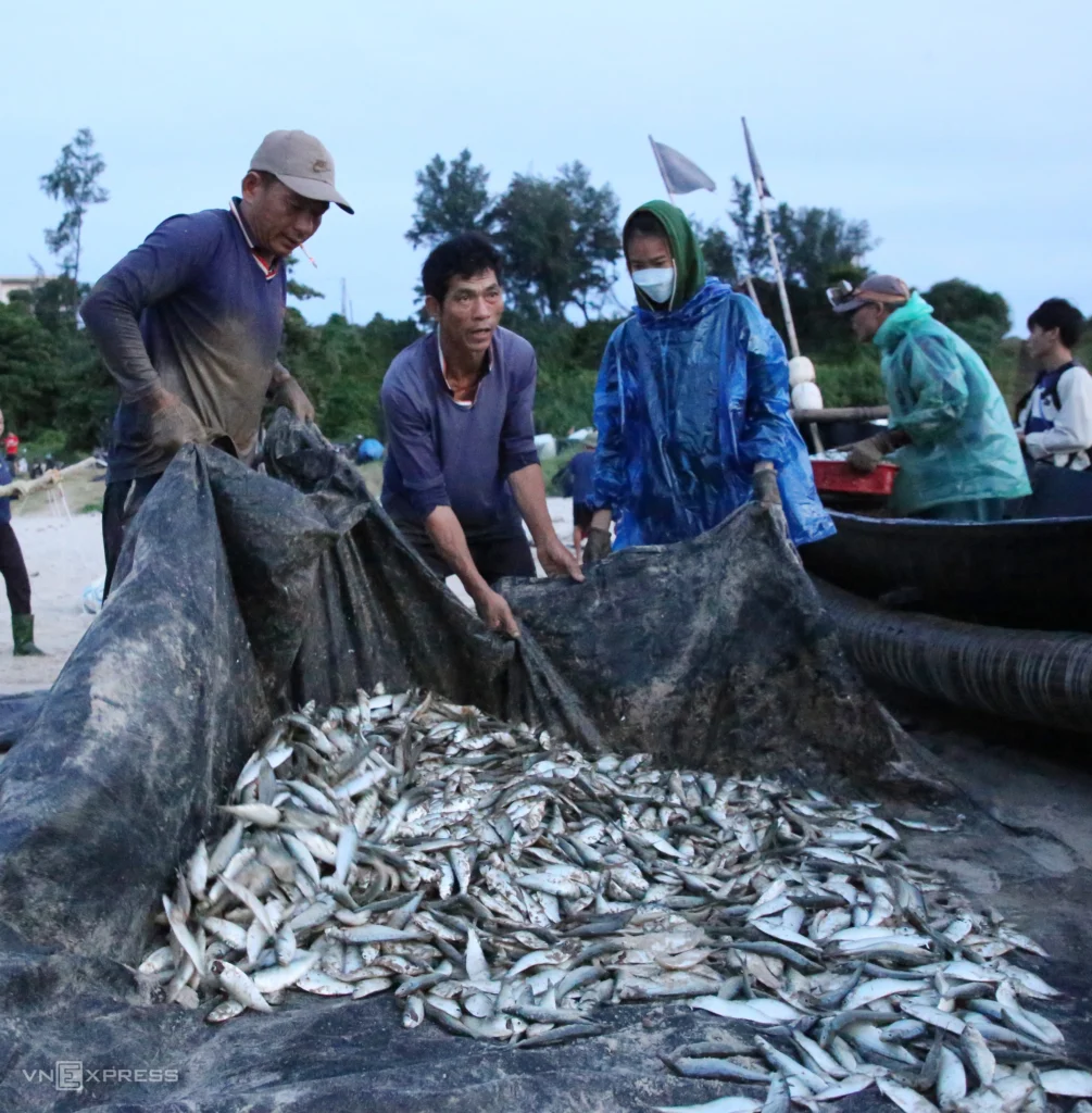 Each boat has 2–3 fishermen who go over a nautical mile offshore, where the water is over 12 meters deep. They cast nets 600–1,000 meters long and 9 meters wide, with floats on top and lead weights at the bottom, forming a long barrier net that blocks the herring’s path. “Herring swim in schools near the surface, so they get caught easily,” Mr. Thanh explained.