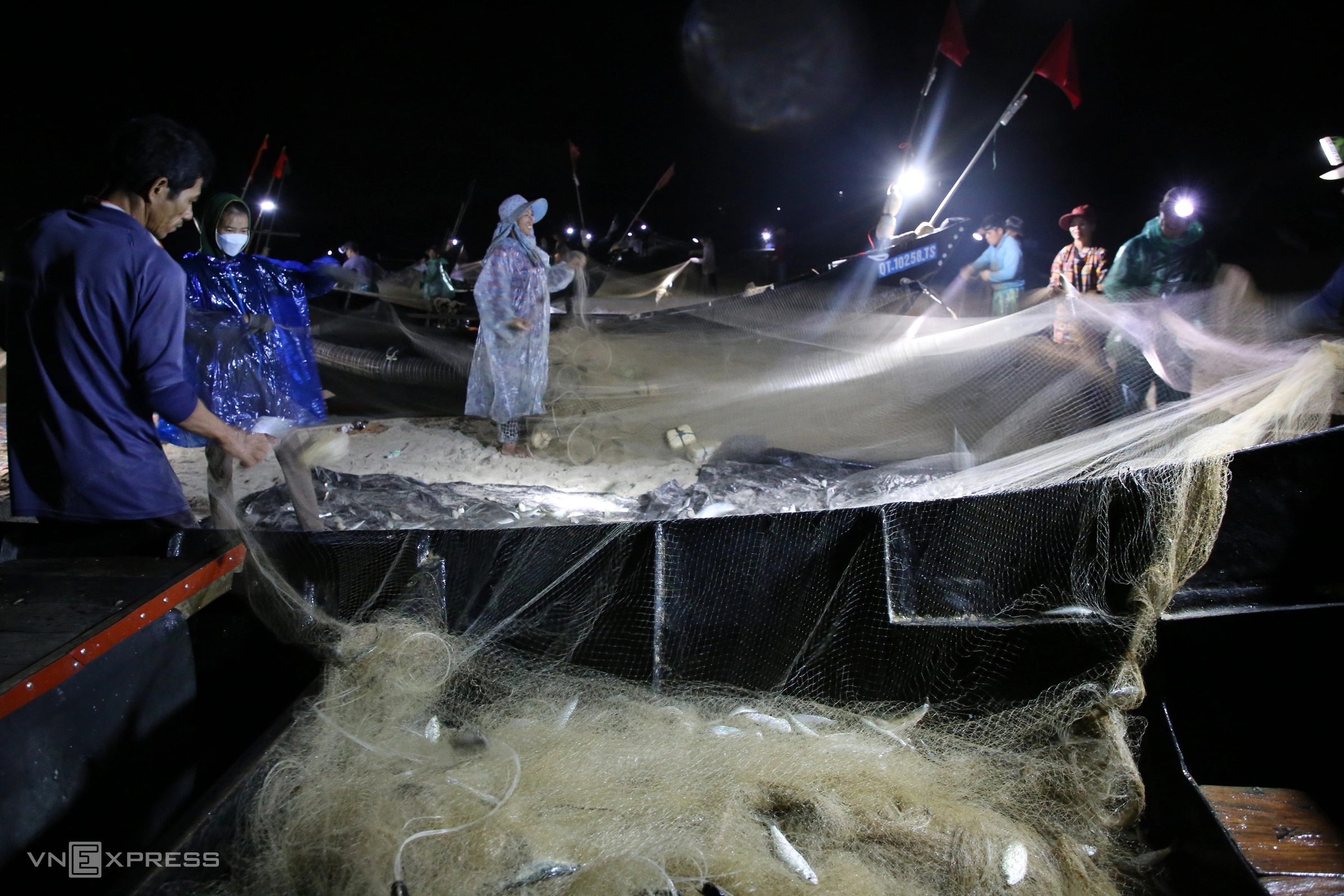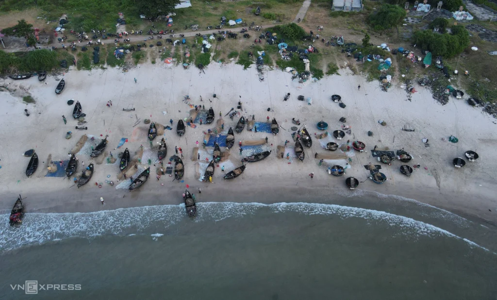 Around 1 a.m. each day, over 50 fishermen from Vinh Moc village, Cua Tung commune (formerly Vinh Linh district), set out to sea in composite boats to catch herring. After 2–3 hours of casting their nets, the boats return one by one to shore.