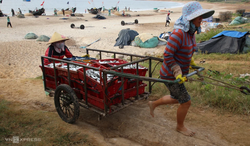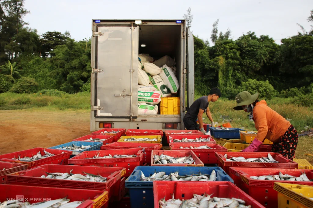 The fish are packed with ice in trays and loaded onto trucks for distribution. Trader Ho Thi Thinh said she delivers herring to Quang Tri and several other provinces in the North Central Coast. “On busy days I buy up to 12 tons, and around 4 tons on slower days,” she said.