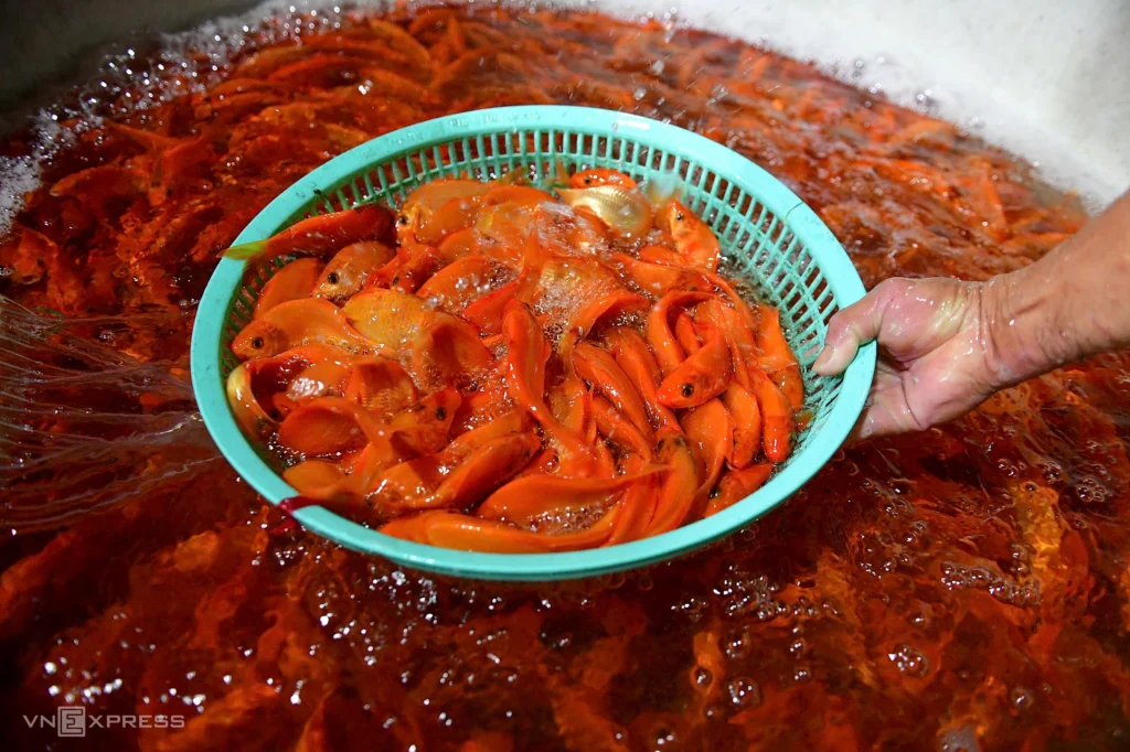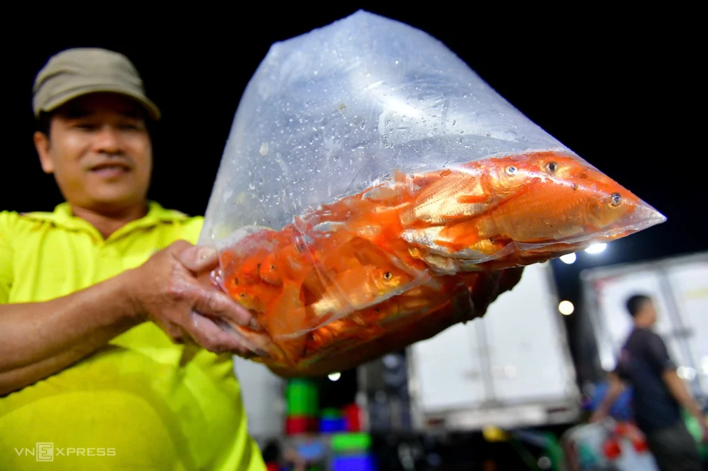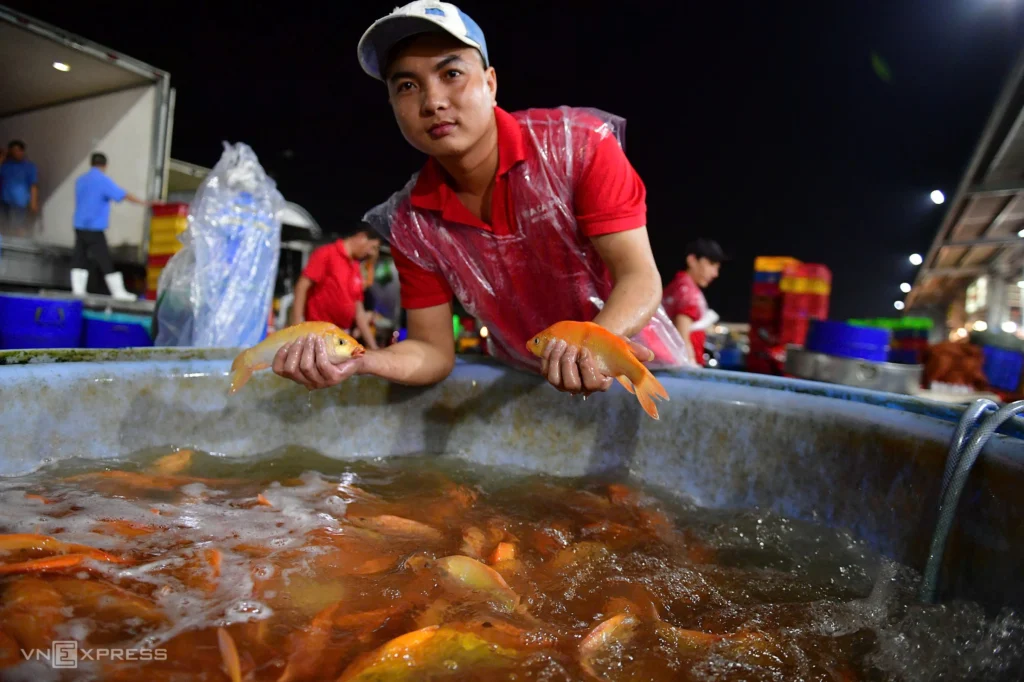 Trinh Duy Tinh (31), owner of Phu Fish Warehouse, said that on this occasion he imported more than one ton of carp to serve people shopping for Kitchen Gods’ Day. “This year, sales are lower than in previous years. In past years, I imported 2–3 tons each season,” Mr. Tinh said.