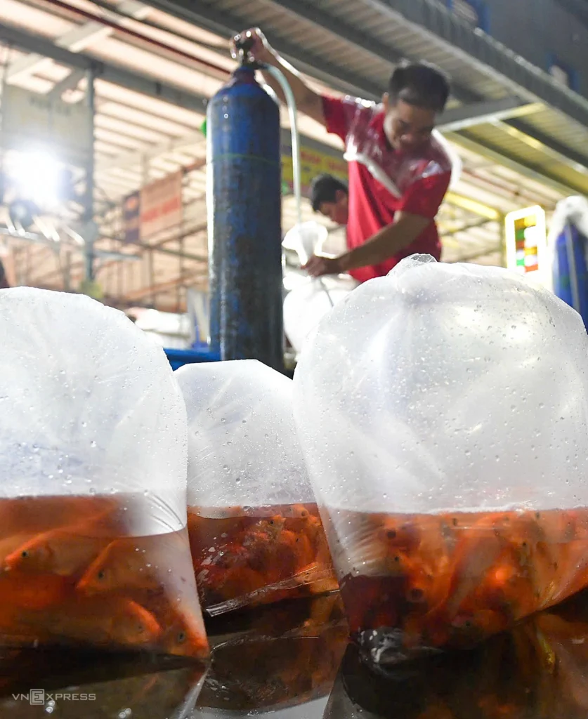The fish are placed in nylon bags and then filled with oxygen before being transported for sale to inner-city markets and neighboring provinces around Ho Chi Minh City.