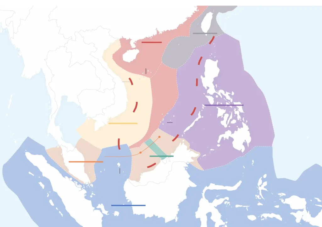 The 1.3 million-square-mile South China Sea and the islands within it are subject to a range of claims from governments around the region. China claims almost all of it as its sovereign territory enclosed within its “nine-dash line,” but others maintain claims based on their exclusive economic zones, which extend 200 nautical miles from their shores. Key disputed spots include the Paracel Islands and Spratly Islands, both locations where China has built military installations on disputed islands.
