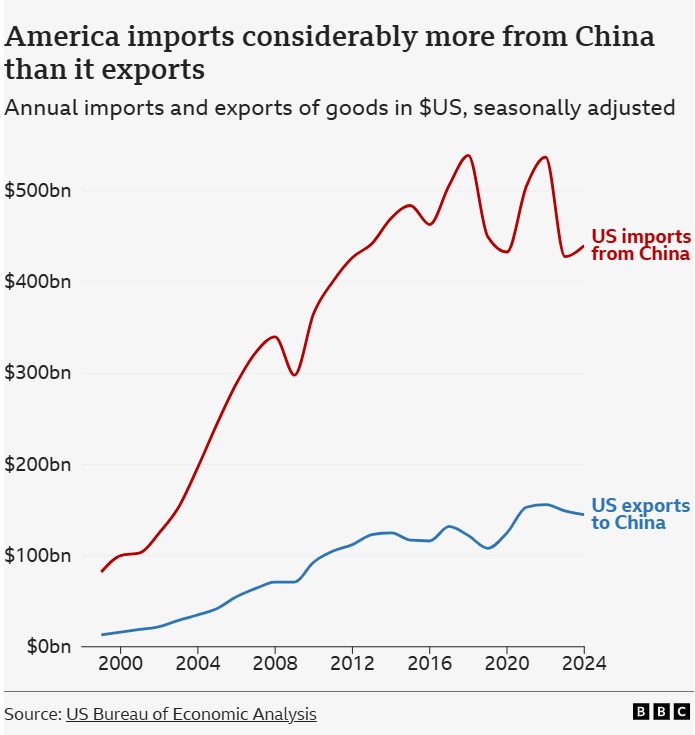 That left the US running a trade deficit with China – the difference between what it imports and exports – of $295bn in 2024. That’s a considerable trade deficit, equivalent to around 1% of the US economy.