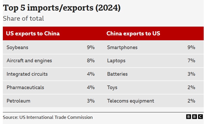Going the other way, from China to the US, were large volumes of electronics, computers and toys. A large amount of batteries, which are vital for electric vehicles, were also exported.
